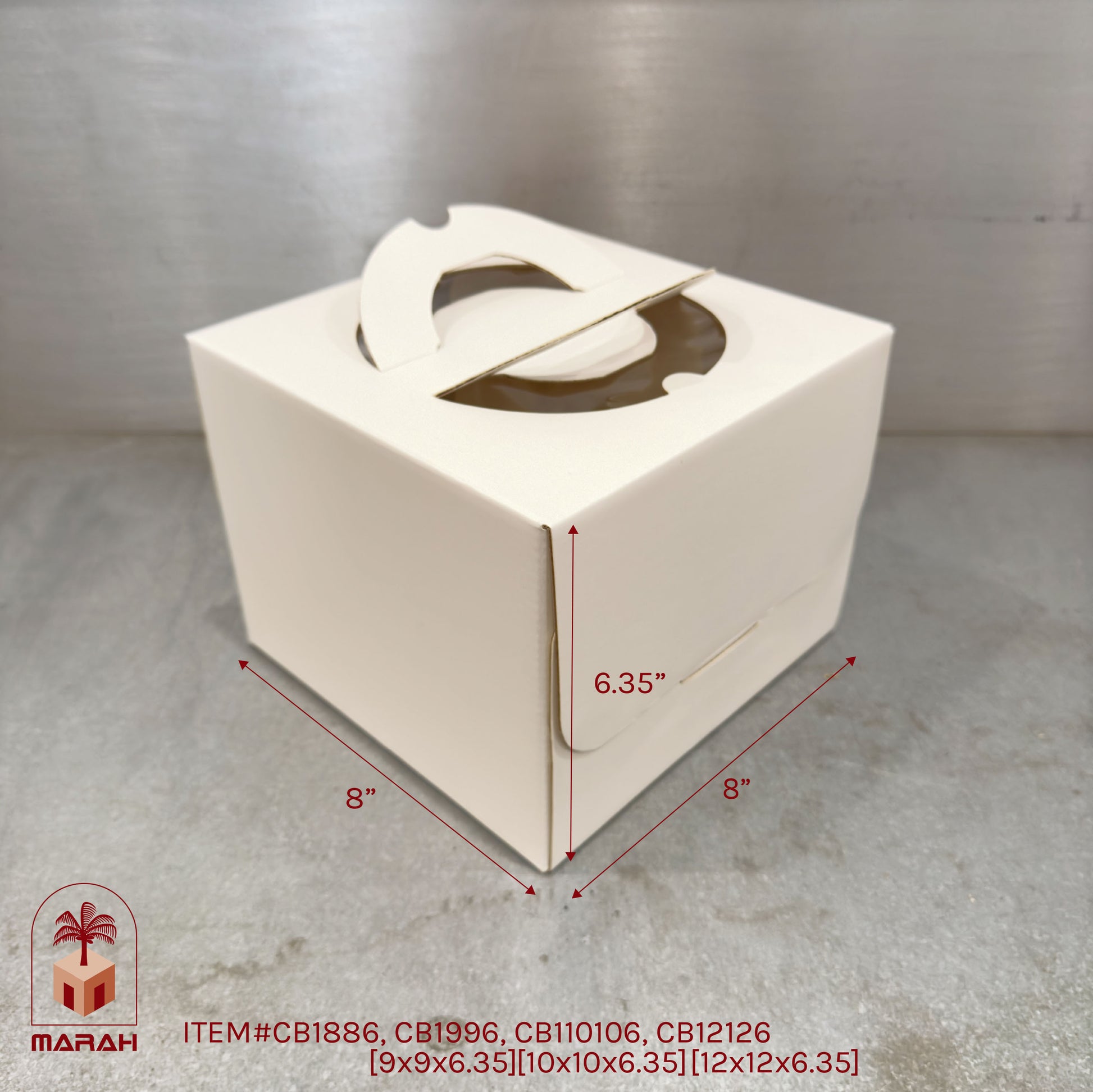 Marah’s carefully crafted cardboard boxes have easy-to-carry handles that are perfect for transporting cakes, pastries, and baked goods. Very durable, but stylish, these cake boxes with handles allow for viewing of the products inside.