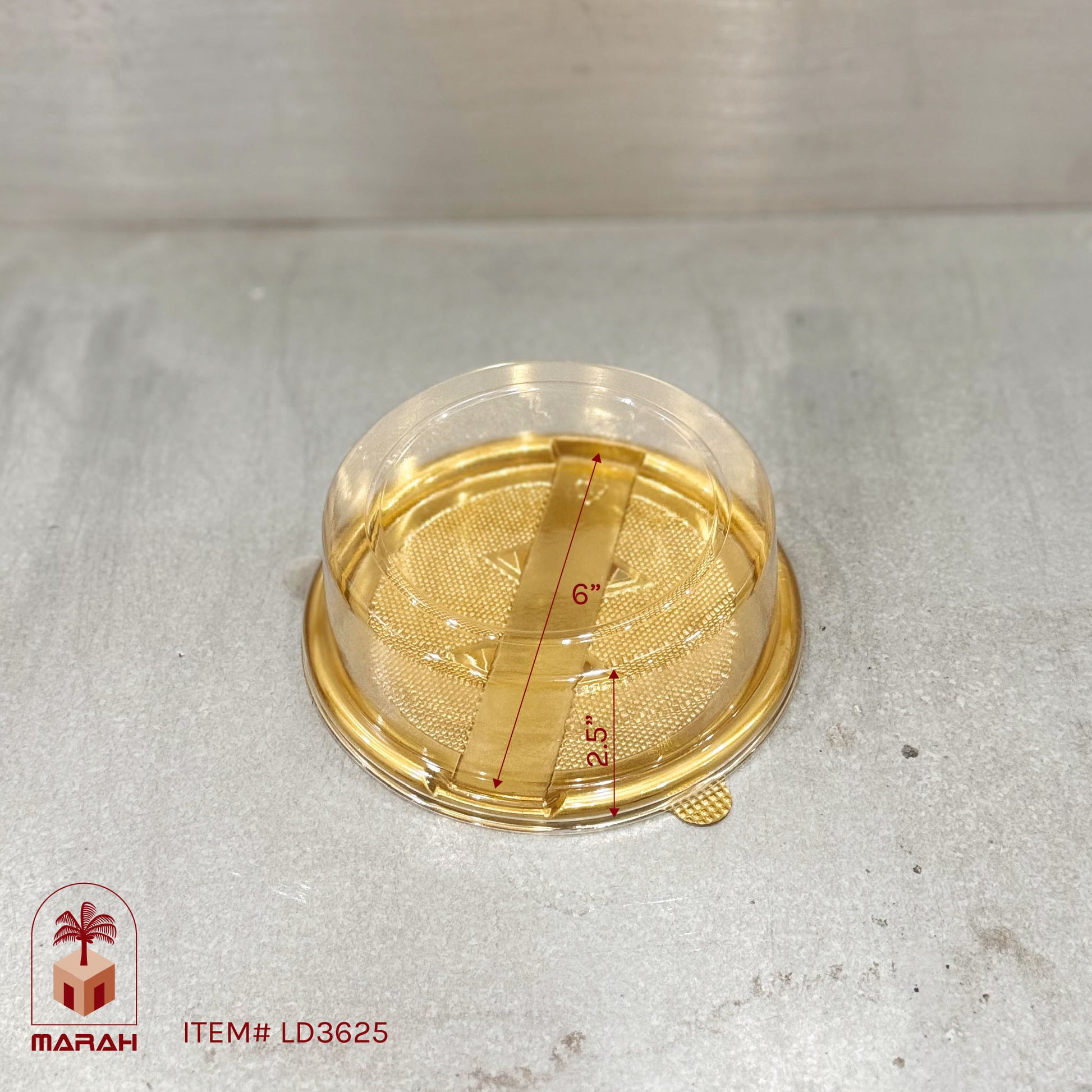 High-quality cake containers that are round and clear plastic with lid from Marah. Durable, six inch cake container with an attractive gold tray for storing and displaying baked goods artfully.