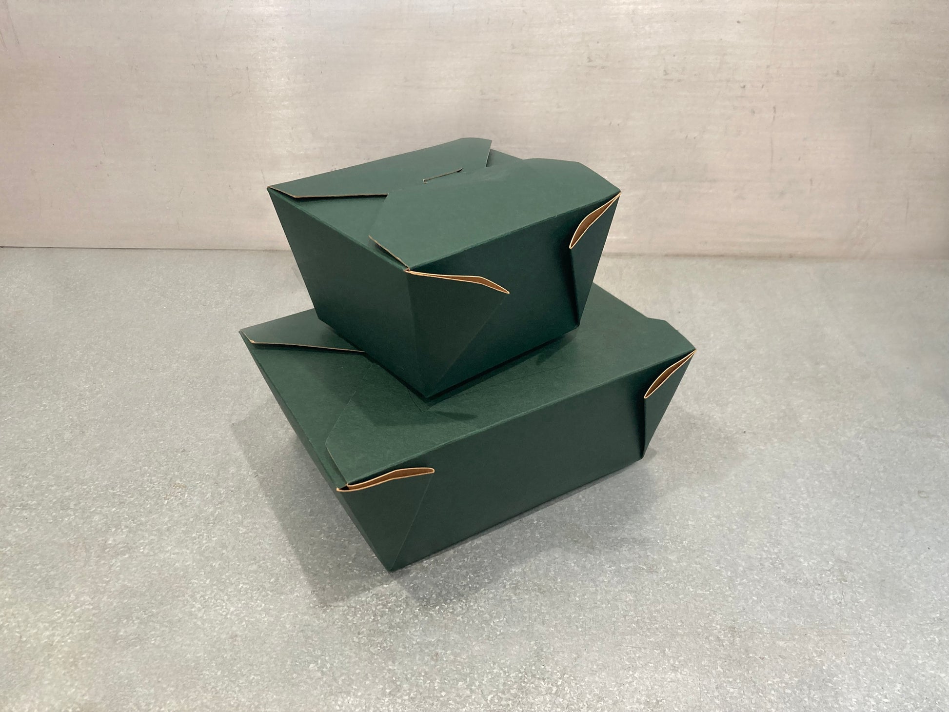Marah's Cardboard Take Out Boxes in dark green. Great for a variety of foods, snacks, desserts. Coated interior makes it oil proof to hold fried food, salad dressing, etc, without the box getting soggy or grease soaking through.